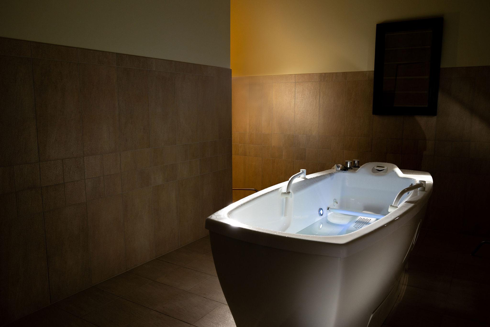 A 15 m long glass corridor connects the hotel with the spa and the spa.